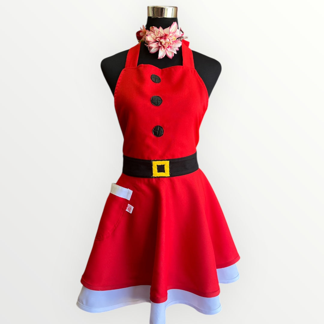Delantal navideño con amarras ajustables en cuello y cintura.