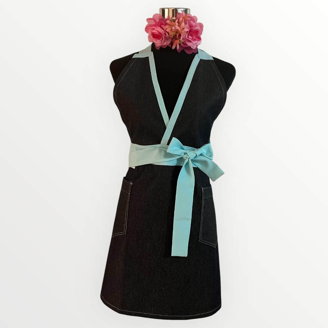 Delantal confeccionado en mezclilla con amarras ajustables en cuello y cintura. Diseño no impermeable