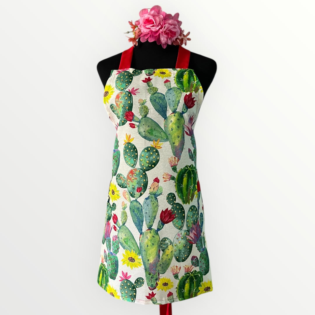 Delantal cactus recto con amarras ajustables en cuello y cintura. Cuenta con bolsillos laterea