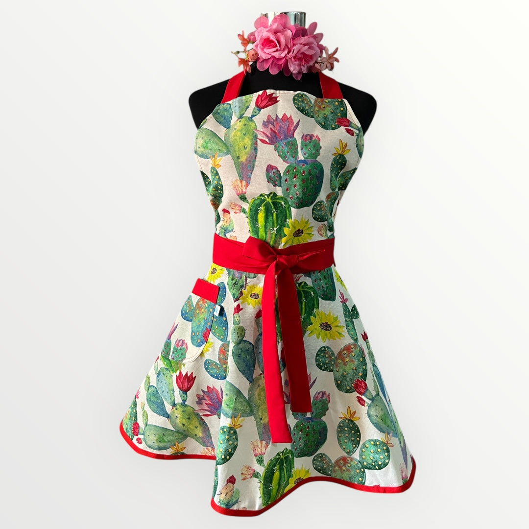 Delantal modelo pin up con amarras ajustables en cuello y cintura.